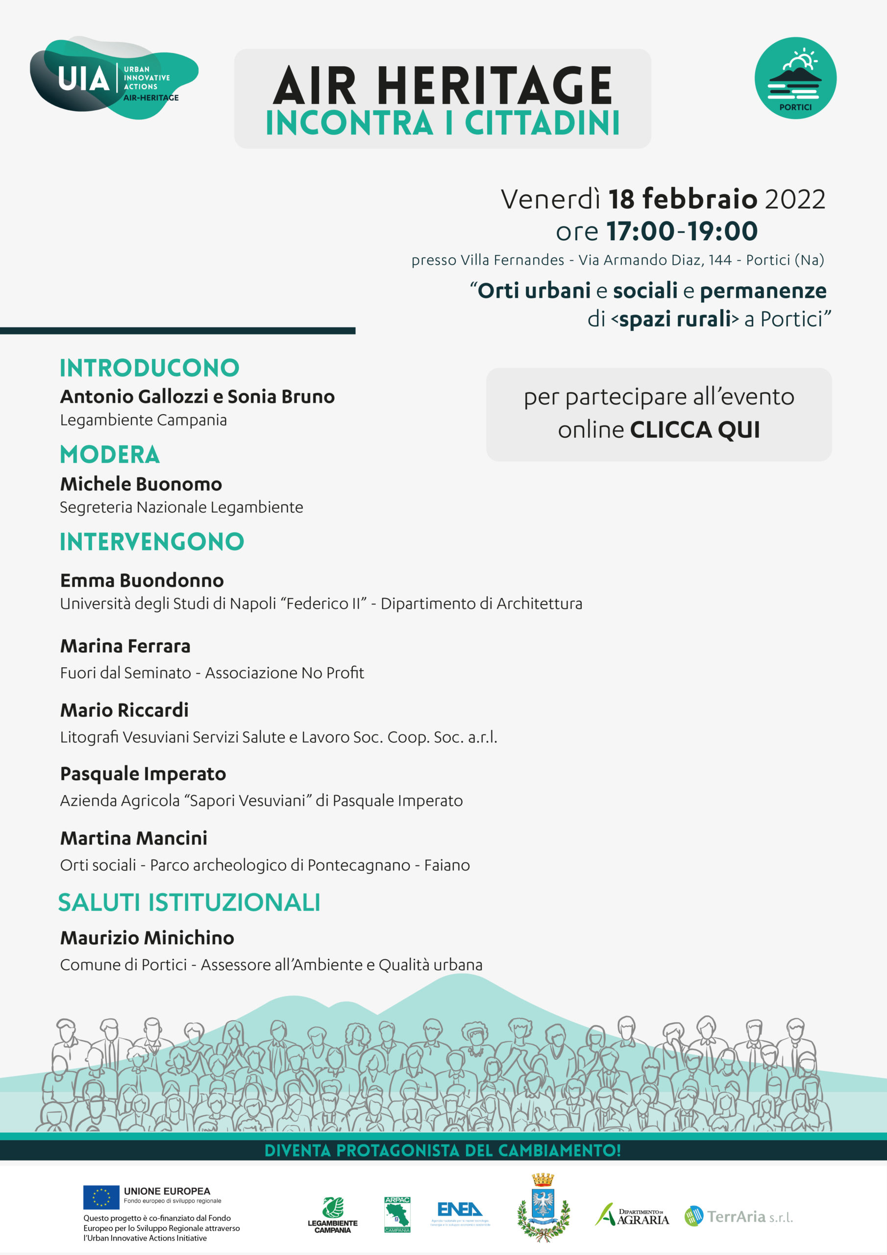 Il 18 febbraio, nell’ambito del ciclo di incontri AIR HERITAGE INCONTRA I CITTADINI, organizzati da Legambiente Campania con i suoi partners, dialogheremo con Enti del terzo settore, Aziende ed Istituzioni sul tema degli Orti sociali ed urbani e degli “spazi rurali”, sopravvissuti nel fitto tessuto urbano di Portici, in risposta alla richiesta di aree verdi coltivabili pervenuta, anche attraverso lo strumento delle Mappe partecipate, da parte dei suoi cittadini, che ci auguriamo si colleghino in tanti anche per un proficuo confronto.